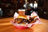 Pulled pork, bacon, coleslaw, onion ring, and provolone cheese with a BBQ sauce drizzle.